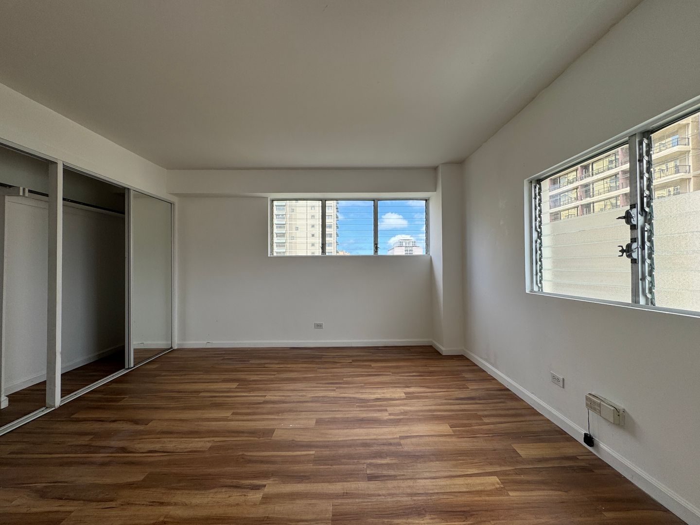 Available in November: Spacious two bedroom/one and a half bath corner unit located in the heart of Waikiki at Twin Towers. Only four units per floor. This 9th floor unit includes laminate wood flooring, stacked washer/dryer, and a full kitchen with new dishwasher. Freshly painted with two newly installed toilets and one new bathroom vanity and sink. Enjoy cool breezes and beautiful views of the Ala Wai Golf Course, mountains, and city from your very own lanai.